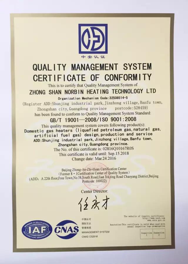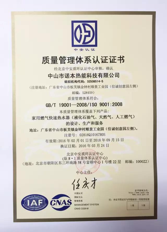 诺本热能通过全体员工的努力,顺利通过了ISO9001:2008体系认证。